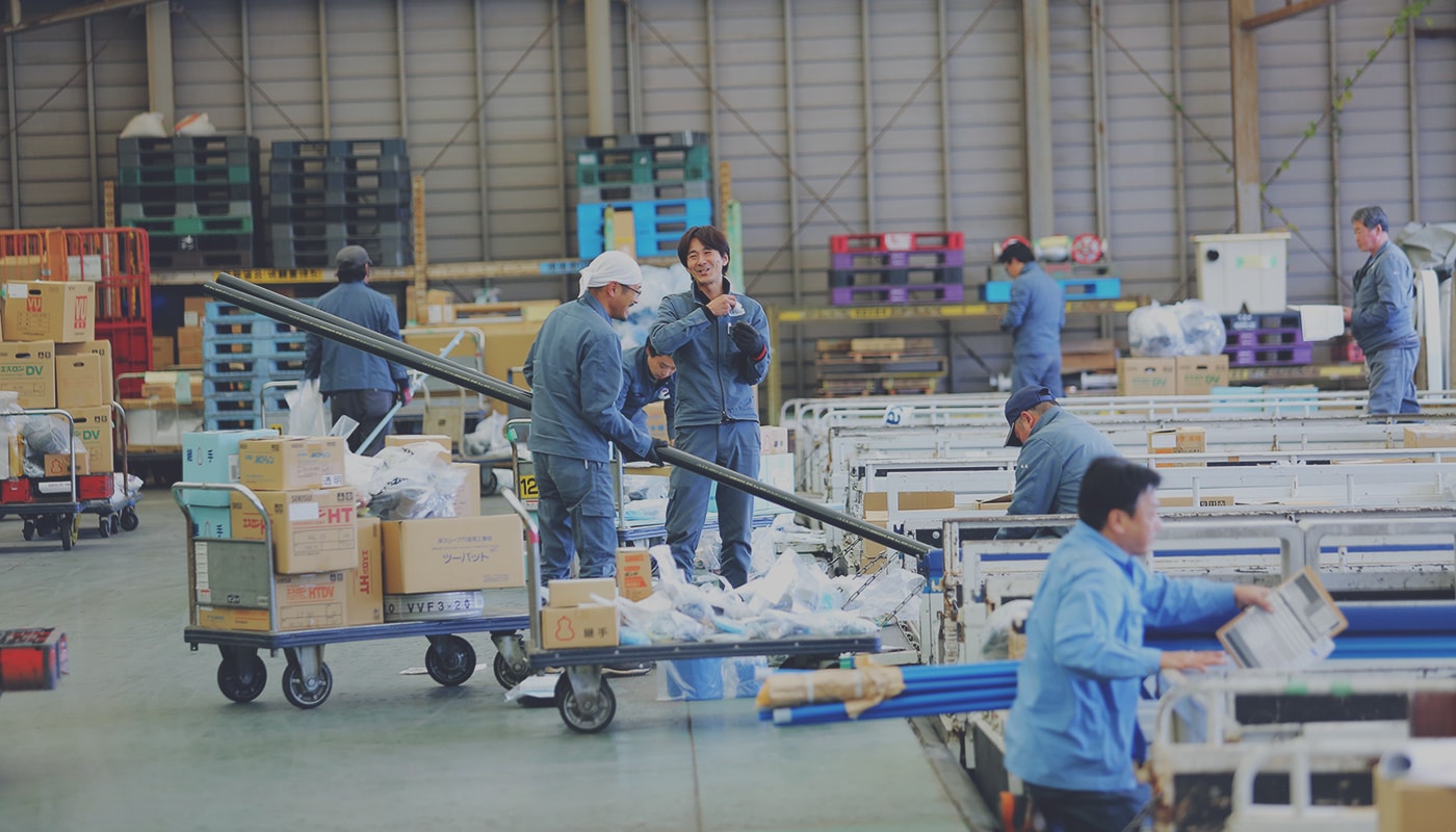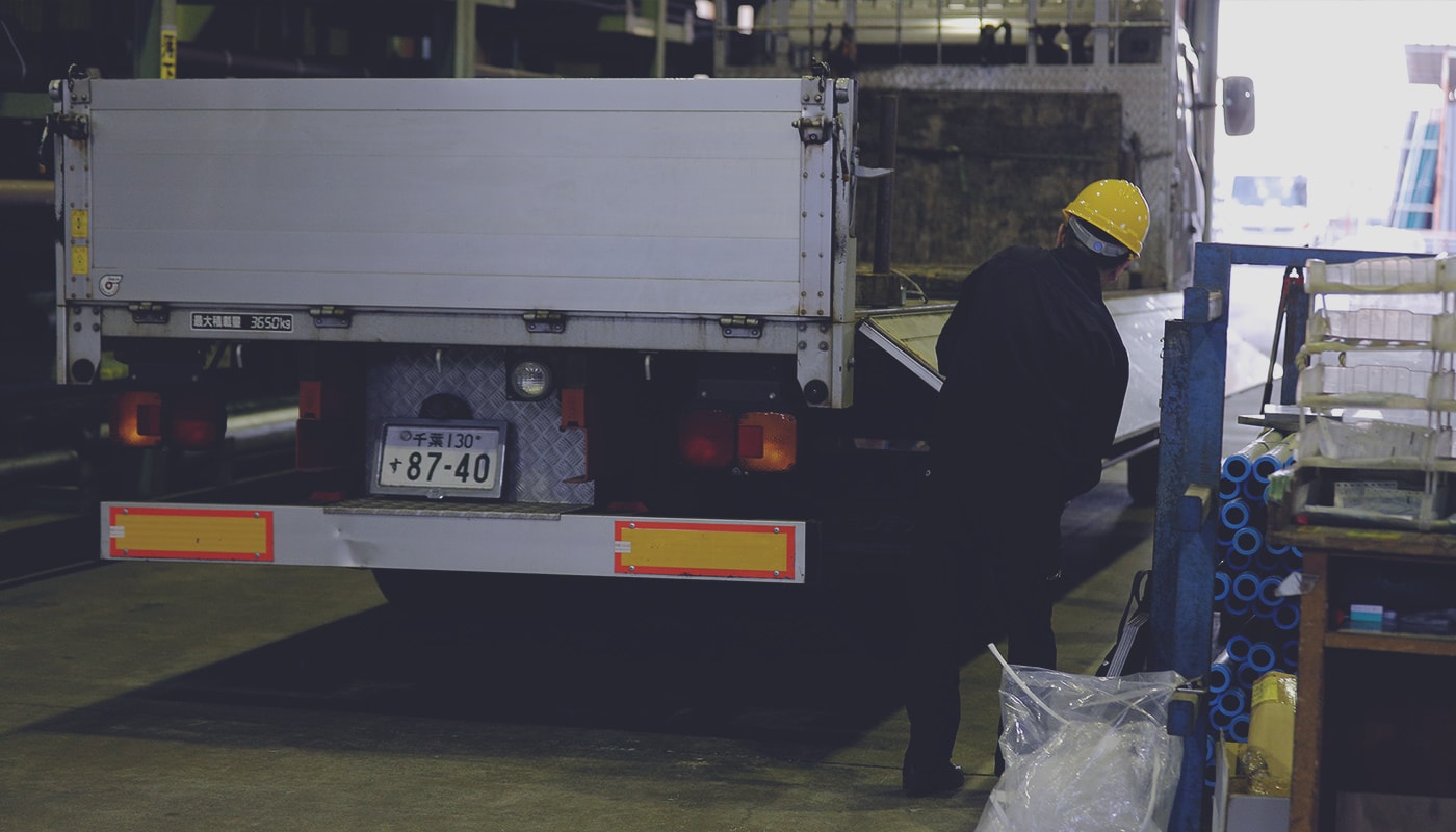 日本管材センターでは1日あたりおよそ、1,600ヵ所の建設現場に、約100台もの配送車輌で配送を行っています。当社では独自の配車システムを構築し、積載量、現場周辺の交通事情などを加味した最適な配送ルートを組むことで、スピーディ、且つスムーズなデリバリーを行っています。
