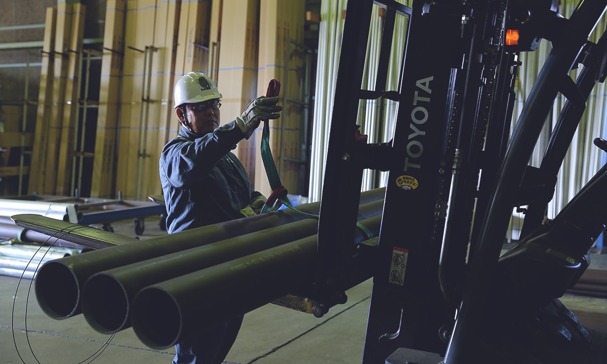 現場の工程をスムーズにするためには、材料を加工した上での納品も重要な鍵となります。新木場配送センターでは加工センターを併設し、転造ねじ加工、ねじ切り及び寸法切り等にも対応しています。また、2016年4月に「TECH LAB常総」を開設。現在は主にパイプの加工を行っていますが、プレハブやユニットを組んだりとあらゆる可能性を追求し、時代のニーズにお応えしてまいります。