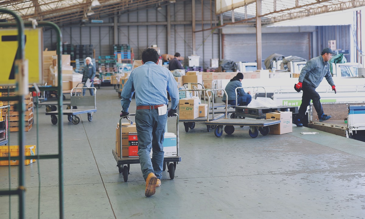 関東平野一円を扇形に見立て、その要に位置している新木場に配送センターを構えております。