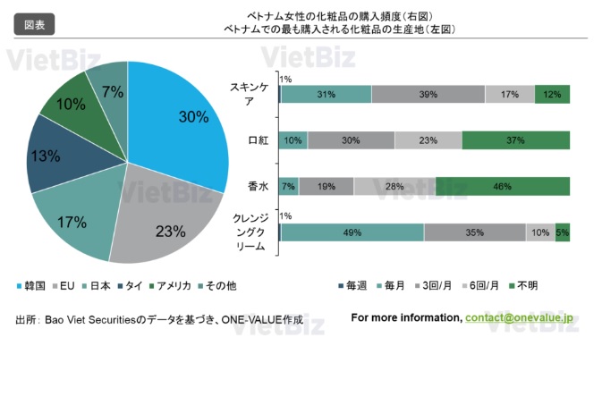 ベトナムで最も購入される化粧品の生産地(左)、ベトナム女性の化粧品の購入頻度(右)
