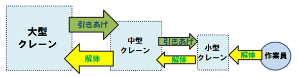 逆に、建ちあげたタワークレーンはどのようにして撤去されているのでしょうか。実は撤去方法も2種類あります。1つ目は「親子亀方式」と呼ばれている、これまで稼働していた大型クレーンが解体用の中型クレーンを引き上げ、その引き上げられた中型クレーンを使って大型クレーンを解体します。そして更に小さな小型クレーンを引き上げ、その小型クレーンで中型クレーンを解体します。最後に小型クレーンを人力で解体・撤去する方法です。2つ目は前述した「マストクライミング」と逆の順序でマストを1つずつ外して縮めていき、最後は地上のクレーンで解体、撤去する方法です。
