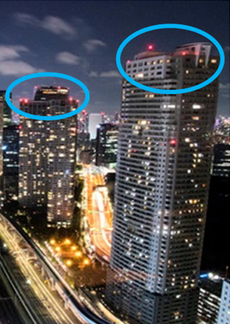 夜になるとタワークレーンの頂上で赤く点滅しているライトを見たことがあるかと思います。実はこのライトは「航空障害灯」と呼ばれているもので、高層物が航空機と接触しないように安全を確保するための灯りです。航空障害灯には航空法により設置基準があり、高層マンションやビルの屋上などにも設置されています。また、タワークレーンや建築物だけではなく高さ120mを誇る茨城県の牛久大仏にも取り付けられています。さらに普段目にするタワークレーンの殆どがオレンジ色(インターナショナルオレンジ色と言います)と白で彩色されていると思いますが、こちらも航空法で定められているカラーリングです。白が光を反射しやすい色なので、オレンジ色をより目立たせる効果を持っており、昼間の標識としての役割を担っています。
