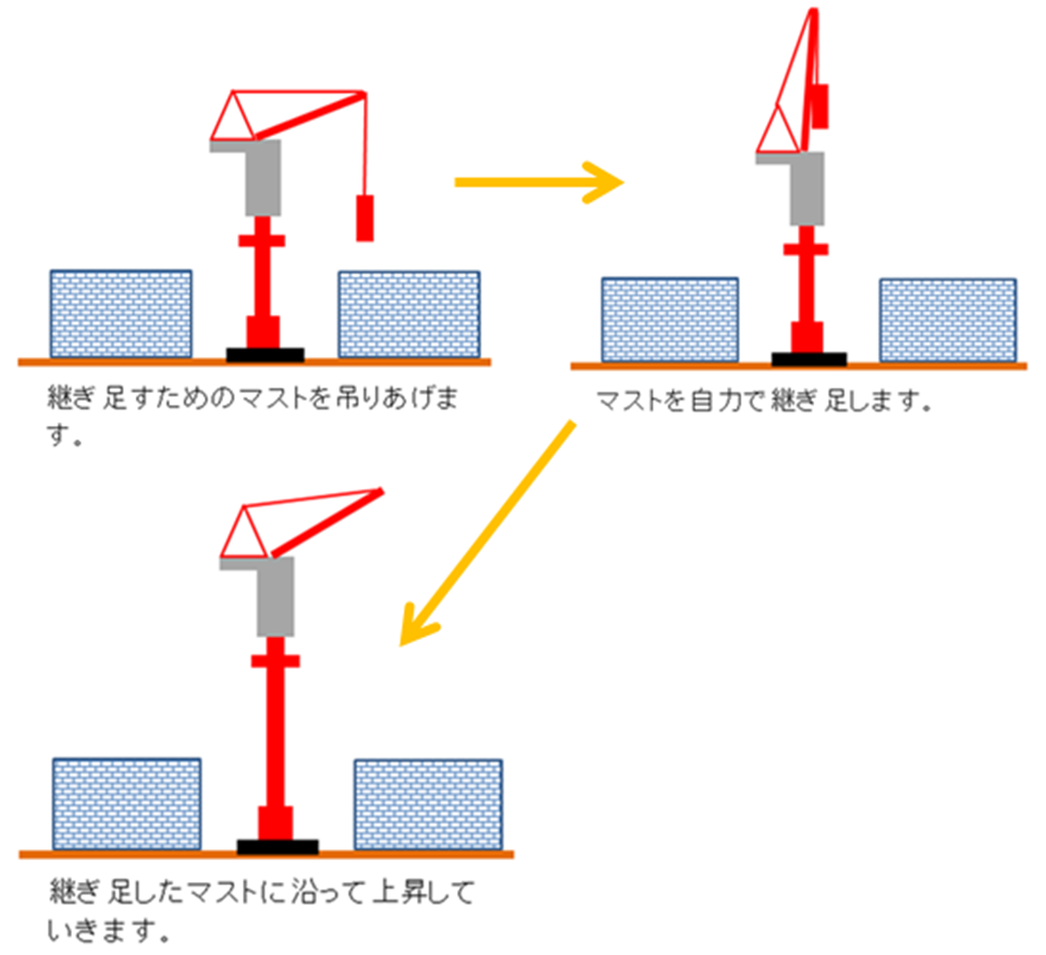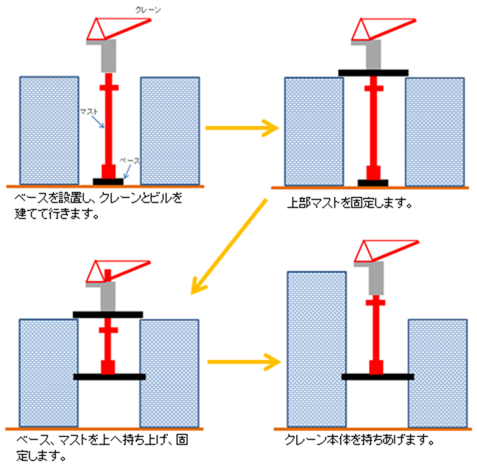 地上から遥か上空で稼働しているタワークレーンを見て、どのような方法であの高さまで上げたのだろう、と不思議に思ったことはありませんか?実はタワークレーンを支えている台座ごと上がっていく「フロアクライミング方式」という方法と、マストと呼ばれている支柱を自ら継ぎ足して上がっていく「マストクライミング方式」という方法の2種類の方法で登っていきます。