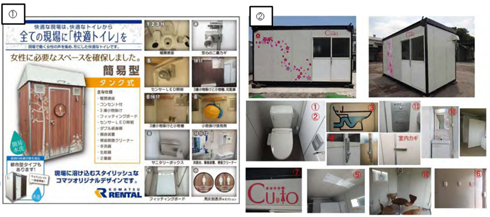 ①のコマツレンタル株式会社の快適トイレ(簡易型)は、まるでトイレに見えないおしゃれな外観が特徴です。暖房便座に、フィッティングボード、擬音装置・・・と女性に嬉しい設備がそろっています。