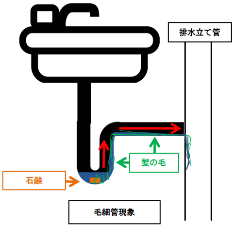 配管内部に髪の毛などの繊維状の物体が垂れ下がると、毛細管現象により内部の水が排水されてしまいます。浴室の床にある排水口ではトラップ内にこびりついた石鹸等に髪の毛が絡まってしまい、気付かない間に毛細管現象によって破封してしまうことがあります。