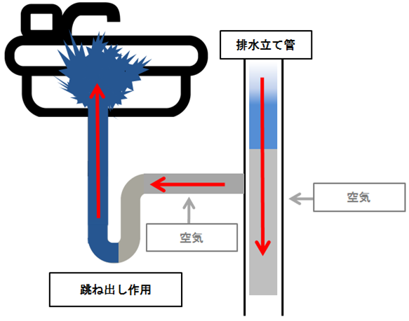 上部から排水立て管に大量排水された際、排水立て管内から空気が押し出され、トラップ内の水が室内側に噴出し、破封してしまうことがあります。