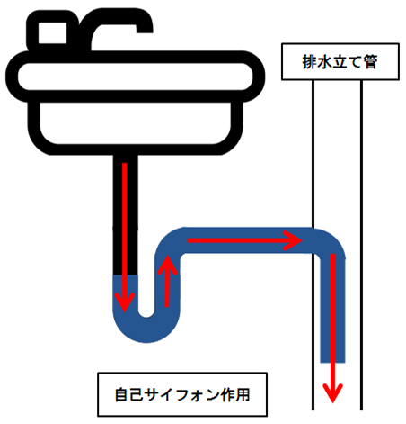2つの管で繋がれた容器がある場合、管の中が満たされた状態であると、2つの容器の内部が同じ量に保とうとすることを「サイフォンの原理」と言います。 大量の水が器具から勢いよく排水されると、サイフォンの原理によって封水分の水も引っ張られて一緒に流れていってしまい、破封することがあります。器具から連続した排水経路内で発生するので、“自己”サイフォン作用と言います。