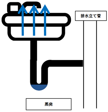 長期間排水が流れないと蒸発により封水が減少してしまいます。例えば、長期の旅行から帰ってきた時にトイレが臭っていた、という経験はありませんか?これは蒸発によって破封してしまい、臭気が排水経路を辿って室内に流れ込んで来たと考えられます。