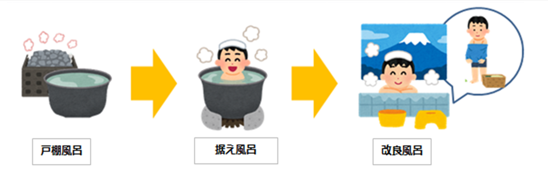 明治~大正時代になると、これまでの「戸棚風呂」や「据え風呂」から「改良風呂」と呼ばれる風呂様式となりました。「改良風呂」は脱衣所や洗い場、水道設備が整ったお風呂のことで、これが現代お風呂の原型となりました。 戦後になると欧米文化の浸透と住宅設備の進化によって、お風呂付の家が一般化されていきました。「家風呂」が普及したのはつい最近の昭和時代です。
