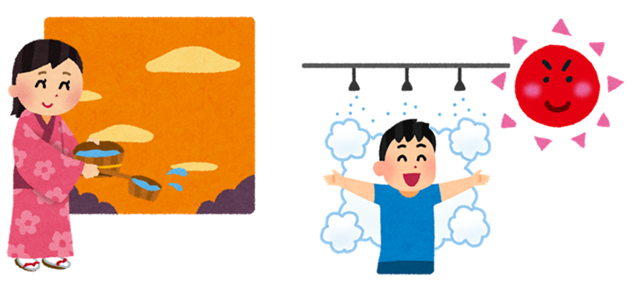 同じ気化熱を利用した暑さ対策に「打ち水」があります。 打ち水とミストシャワーにはどのような違いがあるのでしょうか。 打ち水もミストシャワーも湿度が高くなかなか気化しない状況では、余計に湿度をあげて不快感が増してしまうという点では同じです。 打ち水は一定の量の水を地面に撒き、気化するときに地面周辺の熱を奪うことで、涼しさを感じられるようにするものです。夏の熱い日中に水を撒いてしまうと、あっという間に気化して、すぐに太陽光によって地面の温度が上がってしまいます。そのため夕方、日が落ちてから打ち水をした方が冷却効果を期待できます。 一方、ミストシャワーは継続して水を霧状に散布するので、夕方、日差しが弱くなると空気中に撒かれた水の粒子はなかなか気化しません。ミストの場合は、打ち水とは逆に日中のある程度気温が上がっていて日差しが強い時間帯に散布を行うことで、ミストが短時間で気化し続け、周辺の湿度を上げることなく効果的に冷却を行えます。 打ち水をするなら夕方、ミストシャワーをするなら日中がおすすめということですね。