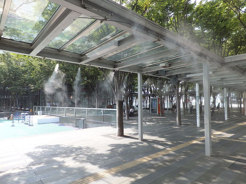 ミストシャワーは2005年の「愛・地球博」で一般に公開されてから、ビルや公共施設などの屋内や屋外での冷却設備として広く利用され始めました。 2020年の東京オリンピック・パラリンピックの暑さ対策としても注目を集めており、会場周辺の駅や、バス停などにも導入が進められています。 屋内では5〜6℃、屋外では2〜3℃の冷却効果があると言われています。 ミストシャワーはミストの冷たさで体を冷やしてくれる、と思いがちですが、メインの効果は気化熱です。気化熱とは、液体が気体になる際に周囲から吸収する熱のことです。お風呂あがりにきちんと体を拭かないと急に体が冷えてしまうのも、この気化熱の原理です。体に付いた水が乾く時に、体から熱を奪っていくのです。