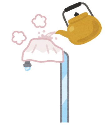 焦って水道管に直接熱湯をかけるのは水道管や蛇口の破損につながるためNGです。万が一凍結してしまった場合には、自然に溶けるのを待つか、凍った部分にタオルをかぶせ、ぬるま湯をゆっくりかけながら溶かしましょう。