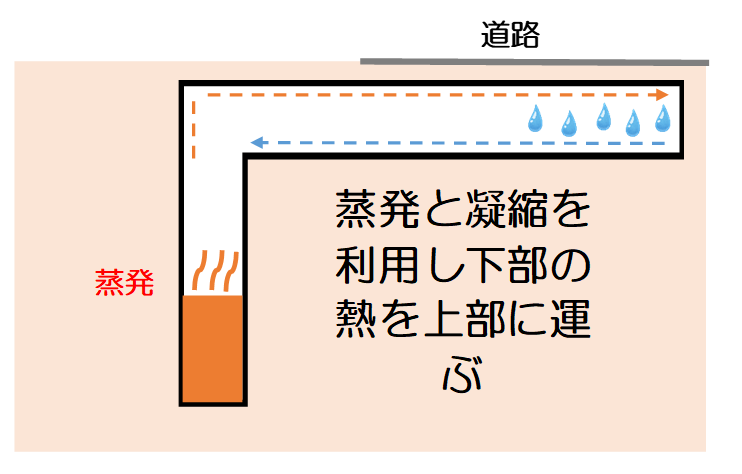 ヒートパイプは、冷媒の蒸発と凝縮で熱を運ぶシステムです。冬に地中の温度が地表に比べて高いと、地中での熱交換でヒートパイプ内部の冷媒が蒸発し、軽い気体となった冷媒は地表に向かって管内を移動します。温度の低い地表環境では、冷媒は周辺に熱を与えることにより凝縮し、この凝縮した冷媒は重力により管内を下降します。ヒートパイプでは自然にこれらを繰り返し、融雪や凍結防止に利用されています。