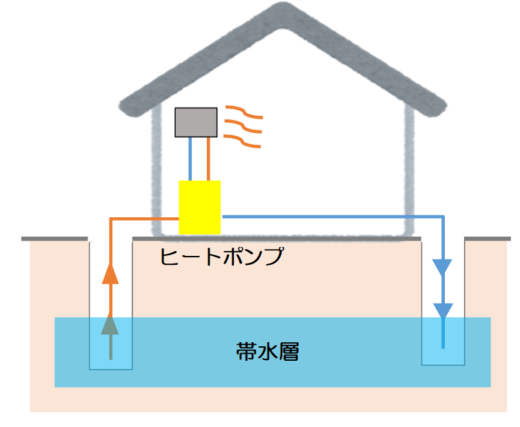 地下水を直接汲み上げてヒートポンプの熱源として利用する方式です。 この方式では井戸水の熱を利用することができます。地下水を直接利用するため、エネルギー効率が高く、省エネルギーです。このシステムは、比較的規模の大きな施設に適用されており、地下水熱利用ヒートポンプシステムとも呼ばれています。