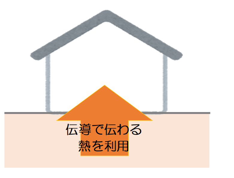 土間床を介した利用方法で、地中から伝わる熱によって住宅内の保温を行います。多くの場合、エアコンを併用して空調が行われます。この方式は、はるか昔から利用されていて、縄文時代の「竪穴式住居」や野菜を保存する室(むろ)も同じ原理で地中熱を利用していました。