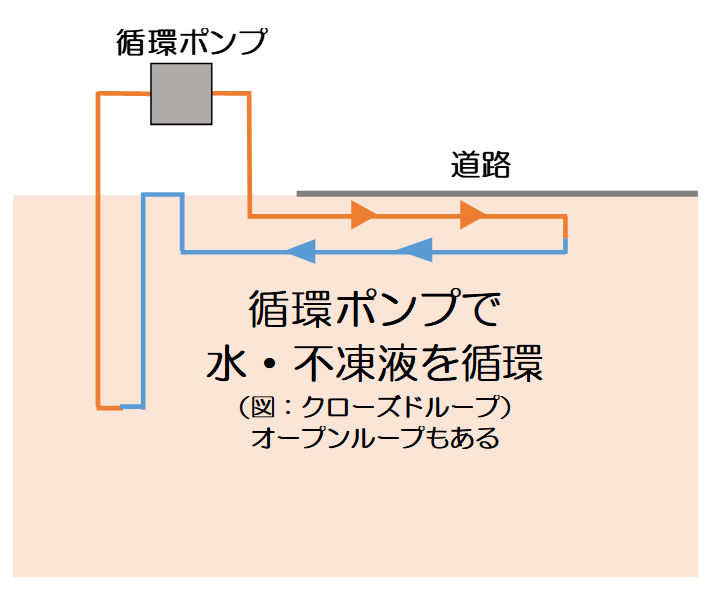 主に融雪に用いられているシステムです。地中熱交換器を埋め込み、路面に埋設したパイプとの間で不凍液などを循環させることで、路面の融雪などを行うクローズドループ方式と、地下水を汲み上げ、それを路面に埋設したパイプに通水させるオープンループ方式の2つの方式があります。
