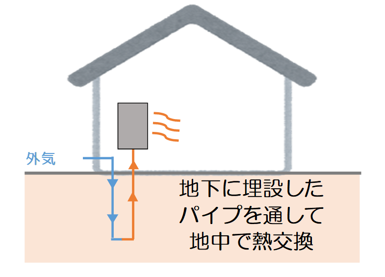 空気を地中に通して地盤との間で熱交換するシステムで、住宅・建築物の換気システムの一環として、地中熱を利用しています。このシステムでは、地中に埋設した熱交換パイプ、あるいはダクトに外気を導入・通気して熱交換を行い、夏は冷風、冬は温風を得ることができます