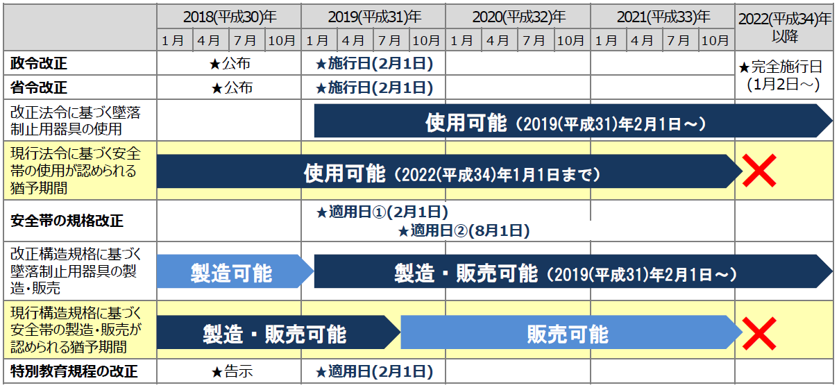 法改正からおよそ2年経っていますが、現在は経過措置(猶予期間)という扱いになっており、着用義務化への完全移行は2022年1月2日です。下図のとおり、現在(2021年3月1日)は旧規格の墜落制止用器具の製造は終了しているものの、販売や使用については認められています。