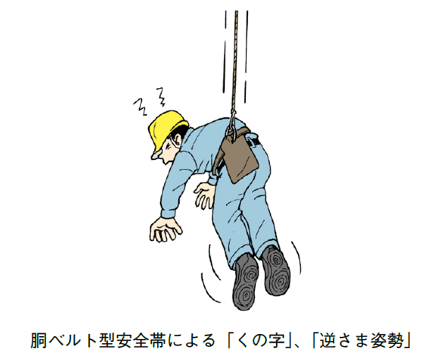 また、宙づり状態が長く続き、救出までに時間がかかると、ベルト部分への荷重で呼吸困難やしびれなどが起こり、危篤状態に陥る可能性があります。落下時に姿勢が安定せずに頭部が下に向く逆さ吊り状態になると、血圧等の負担がかかるだけでなく、地面との落下距離が短い場合には、頭から衝突することも考えられます。