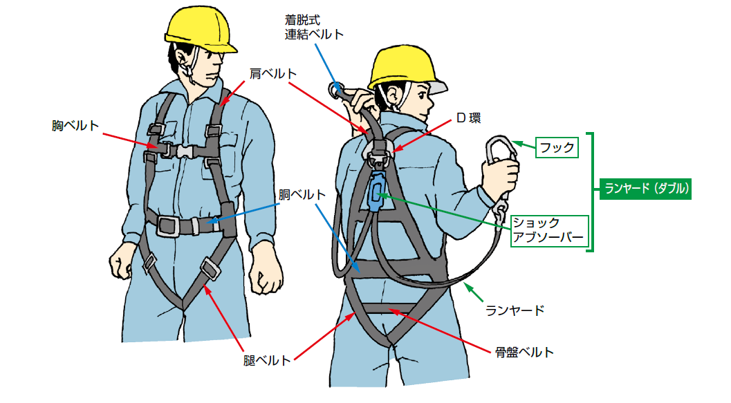 そのため、複数のベルトで支持することで衝撃を分散でき、落下時も直立姿勢となるフルハーネス型の着用を基本としています。