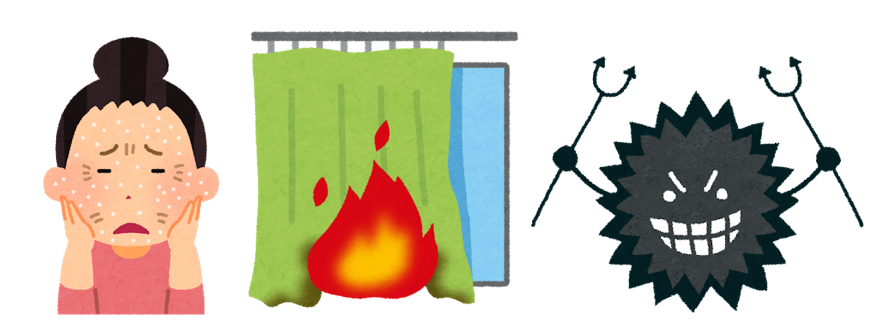 乾燥状態では、肌がカサカサになったり、火事の危険性が高まったりと様々なリスクがあります。加えて、くしゃみや咳をした際に飛び散る飛沫は、湿度が低いと飛沫から水分が蒸発して軽くなり長時間空気中を漂い、空気感染するリスクを高めます。昨今の新型コロナウイルスに限らず、風邪やインフルエンザなどの感染症の予防のためにも、なるべく室内の乾燥対策を行っていきましょう。