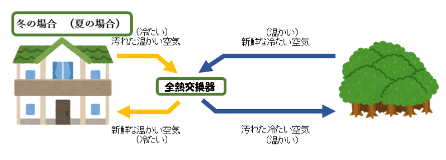 一般的な換気扇は空気の入れ替え、いわゆる換気を行うだけですが、全熱交換器は換気をしながら空調機能を補助し、室温を保つことができます。