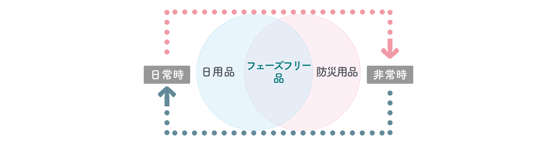 身のまわりにあるモノやサービスを、日常時はもちろん非常時にも役立つようにデザインしようという考え方を「フェーズフリー」といいます。(一般社団法人フェーズフリー協会HPより引用)